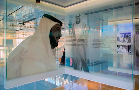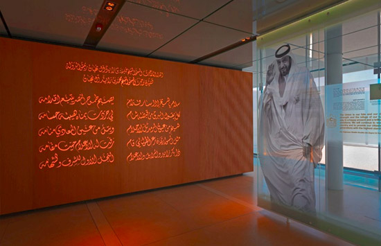 An exhibition hall, housed in a glass-walled space within the courtyard of Qasr Al Muwaiji, has been built to tell the story of the fort and its inhabitants, with a focus on His Highness Sheikh Khalifa bin Zayed Al Nahyan.