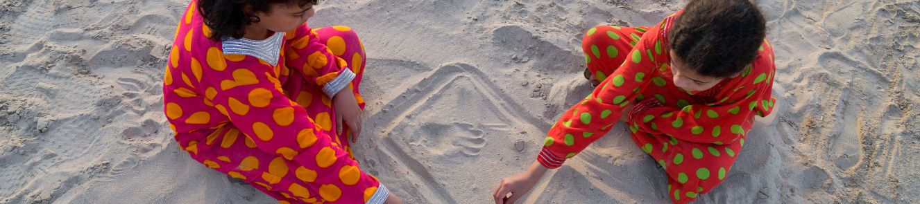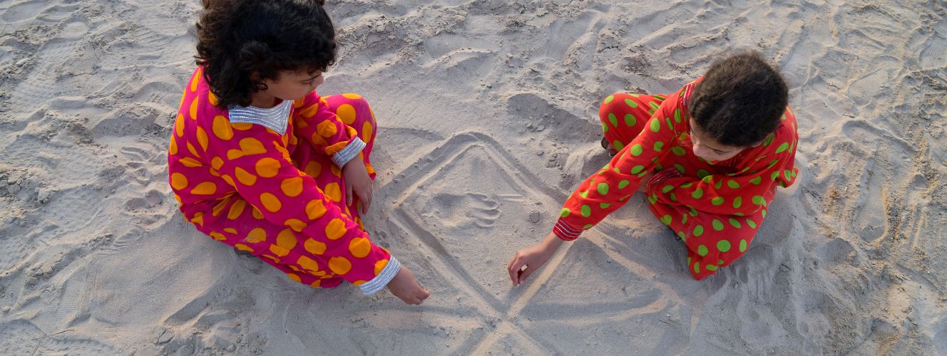 Hatha bayt mennou (Whose house is this?) is a popular traditional game that is usually played by both boys and girls separately. It is a simple game that requires good memory. Children mostly play it at night, sitting in a circle at their home’s sandy yard. The game is usually played in groups of 2-4. The game starts with one of the players flattening the sand with their palms, then drawing one of the neighbours’ houses, i.e., the components that make up the house, including the walls and main door and where it faces, followed by the rooms and their doors, the kitchen and other features. All of these structures are accurately drawn in terms of the player’s perception of the house.