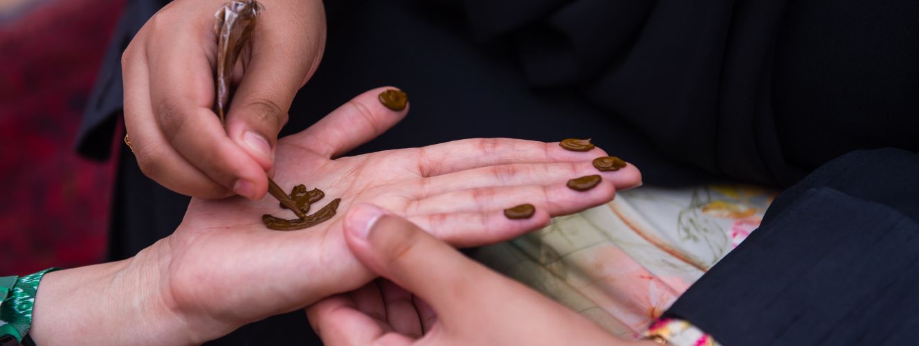 Some of the traditional inscriptions are featured during national occasions and by grandmothers. Among the most famous inscriptions at that time were “ghamsa” in which the hand is dipped completely from the front and back with henna, “gussa” is done on the fingers and the half or the entire palm of the hand, “shera’a” is in the form of a triangle, “rawayeb” is done on the tips of the fingers, “tila” is a point in the form of a marble and “kazoa henna” is done the form of a kazoa bean.