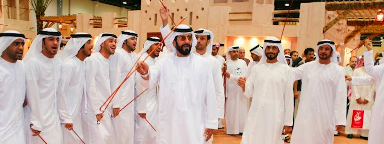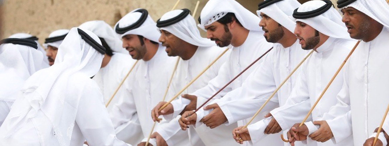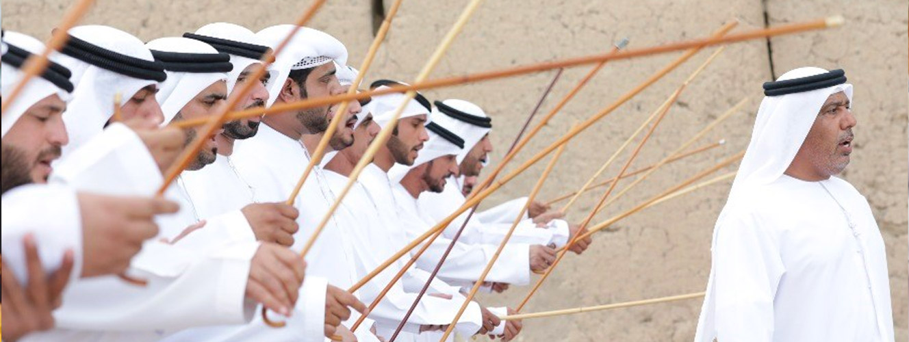 Al-Razfa is a traditional performance comprising dance and poetry that is deeply rooted in United Arab Emirates culture and an important addition to intangible cultural heritage. Performed at weddings, national holidays and other special events, it is a popular Emirati performance that combines poetry with a dance that uses thin bamboo canes. In the past, swords or daggers were used instead of canes. This delightful art gives performers a sense of identity and communication through their songs and rhythms that have been maintained in Emirati culture for many years