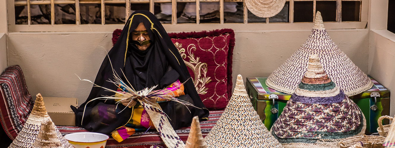 The narrator Shamsa Al Shamsi explains that the jafeer is comprised of a sack with two handles. It tends to be large and can be placed under food or hung on walls as home décor.