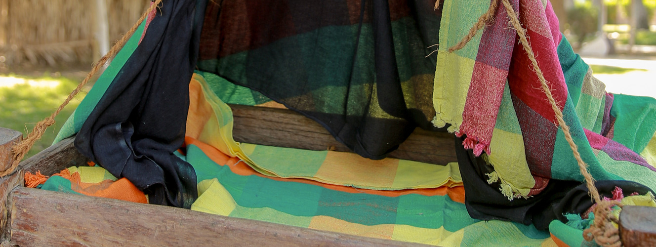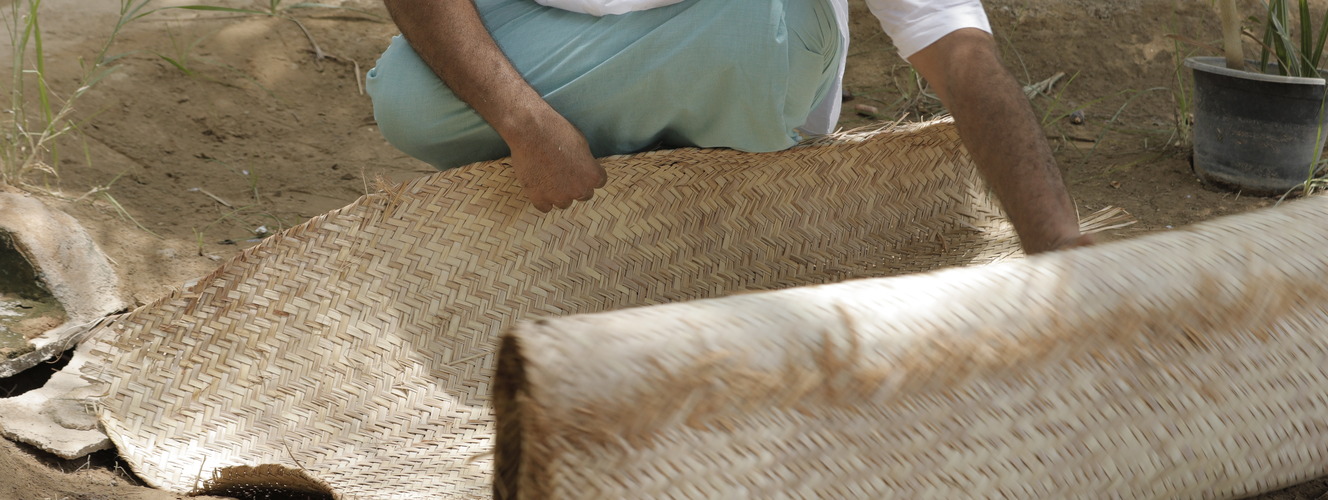 Pillows, "mawasid” are made of fabric and are stuffed with cotton or pieces of cloth, so that they are comfortable. They would also sometimes be stuffed with the small granules of Arak trees, which are commonly found in the UAE. The branches of Arak trees contain small white granules that have a spongy texture. Another important piece of furniture is the haseer, which is a wide rug with a width of about two meters and a length of approximately 5 meters. It is made of thick palm wicker arranged in long symmetrical lines. It is also sometimes made from other trees. In the past, it would be used to cover the floors of rooms in homes as well as the floor of the manama. It would also be used in covering the deceased. In addition, people would sit on the haseer when in the courtyard. Some types of haseer were also used to cover ceilings or protect tents from the rain.
